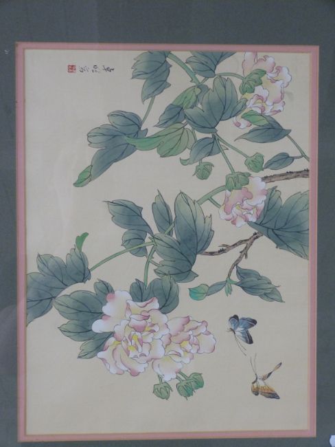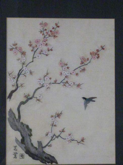 Four Chinese embroideries and watercolours depicting prunus blossom, birds and insects, largest 40 x 30cm