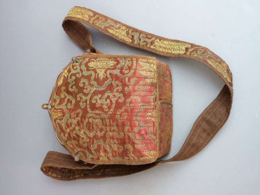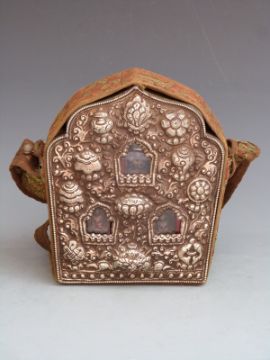 Tibetan white metal travelling shrine or reliquary with windows showing deities, in silk carrying case, W24 x D20 x H8cm