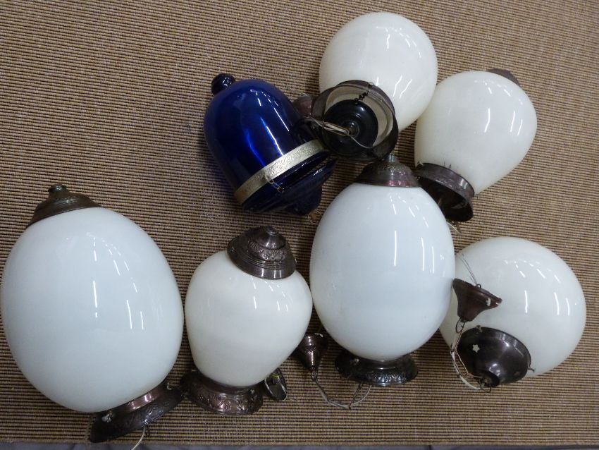Five various glass globe shaped light fittings, height of tallest 48cm