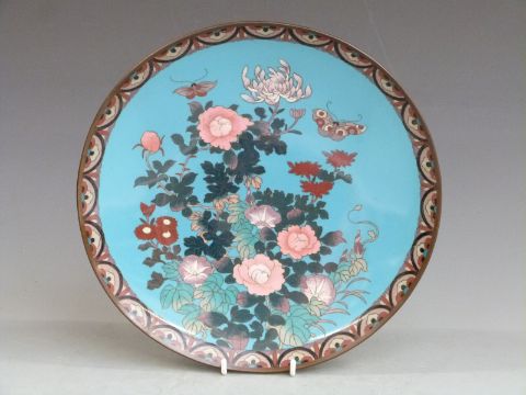 A 19thC Japanese cloisonné charger with butterfly and floral decoration, diameter 29.5cm