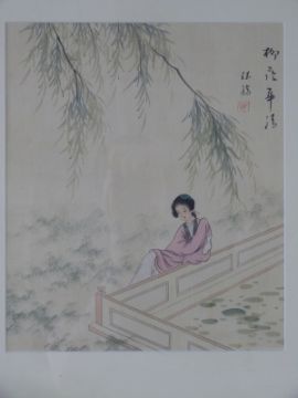 Four Japanese framed watercolours on silk of geisha girls, signed to corners 34 x 29cm
