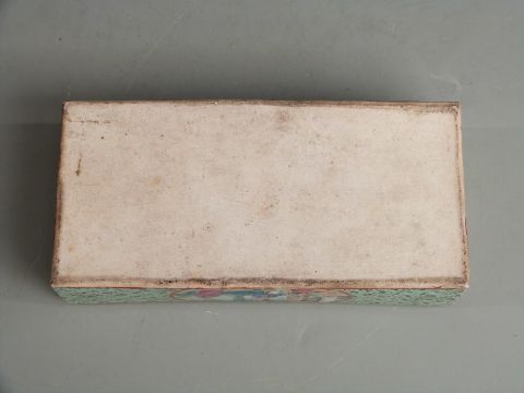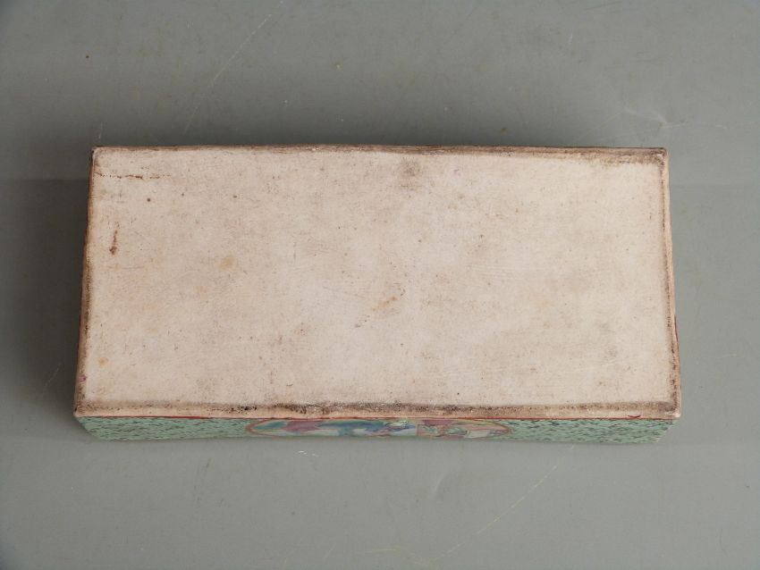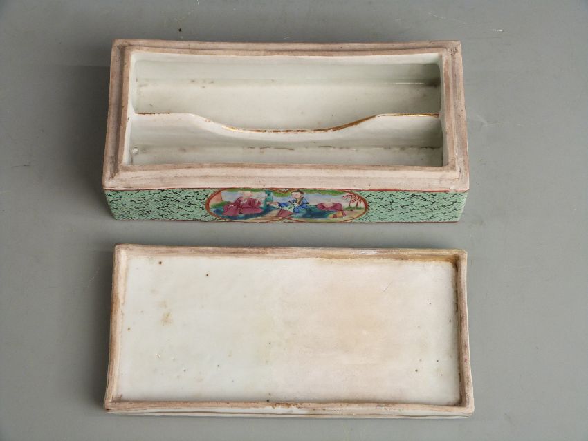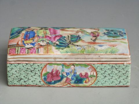 A 19thC Chinese Canton famille rose scholar's/ scribe's box with figural court scene decoration, gilt detailing and segmented interior, 18x9x6cm.