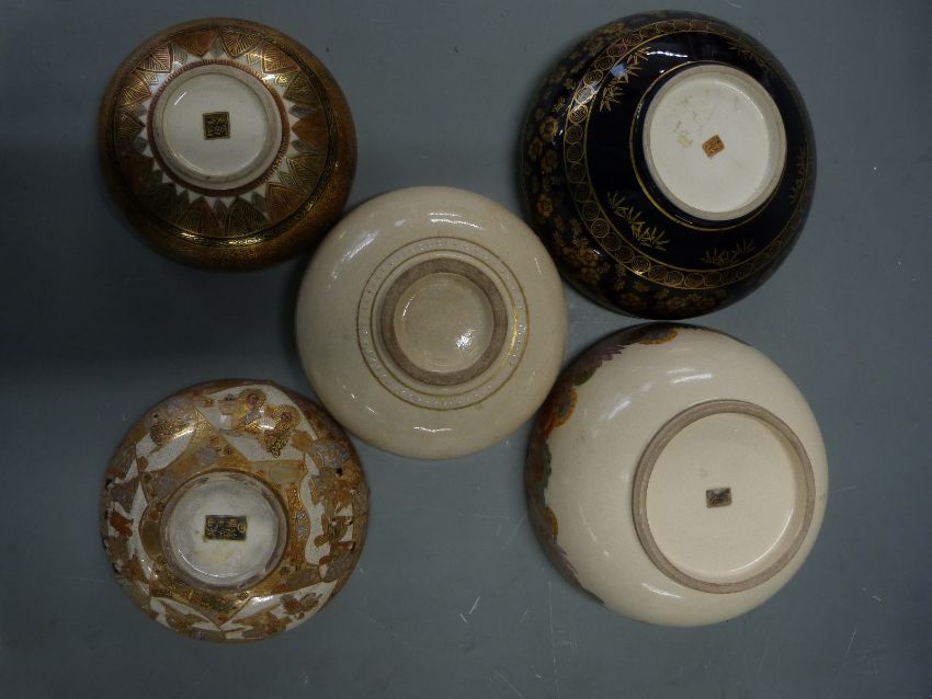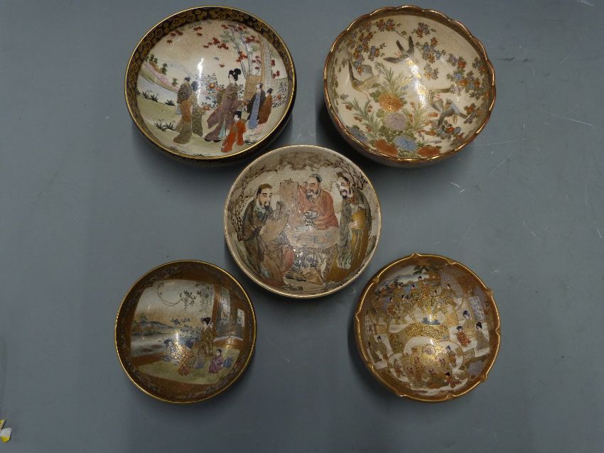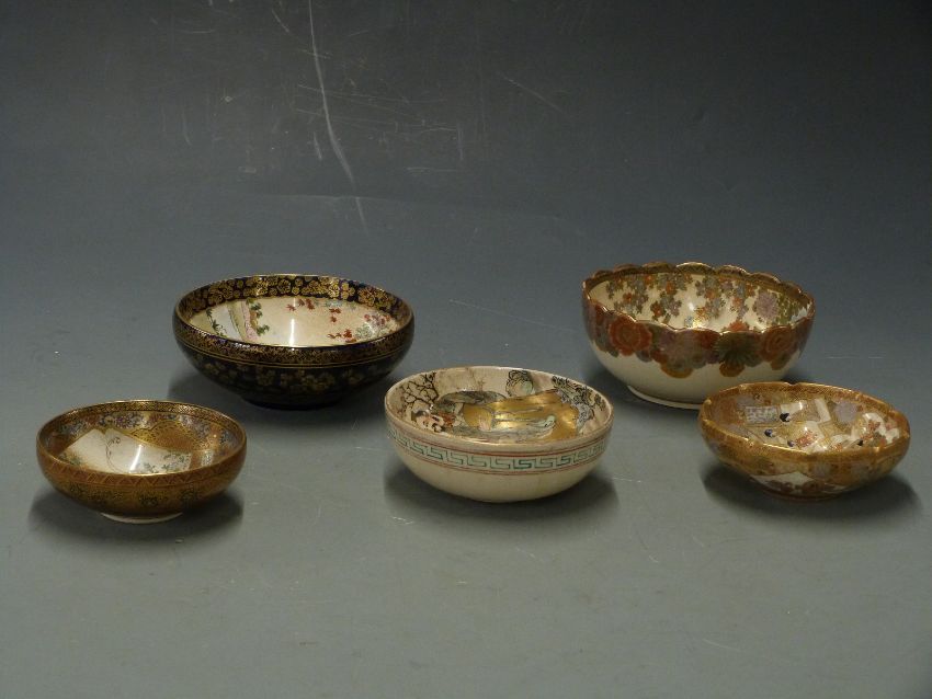 Five Japanese Satsuma bowls, largest diameter 15.5cm