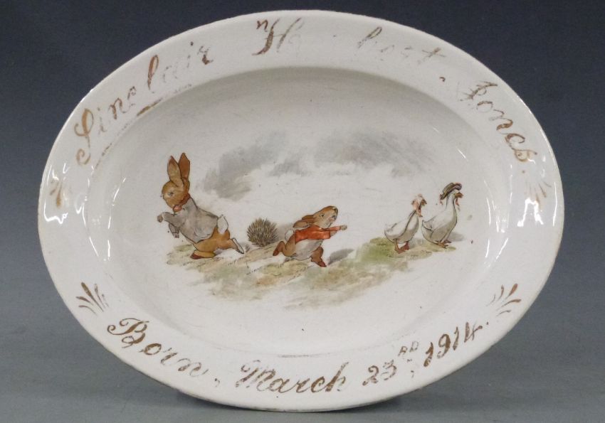 [Beatrix Potter] children’s dish with colour images of Peter Rabbit, Benjamin Bunny and Puddle Ducks inside the bowl, child's name & date of 1914 in gold around the edge, heightened in gold around rim and base