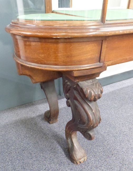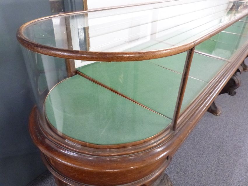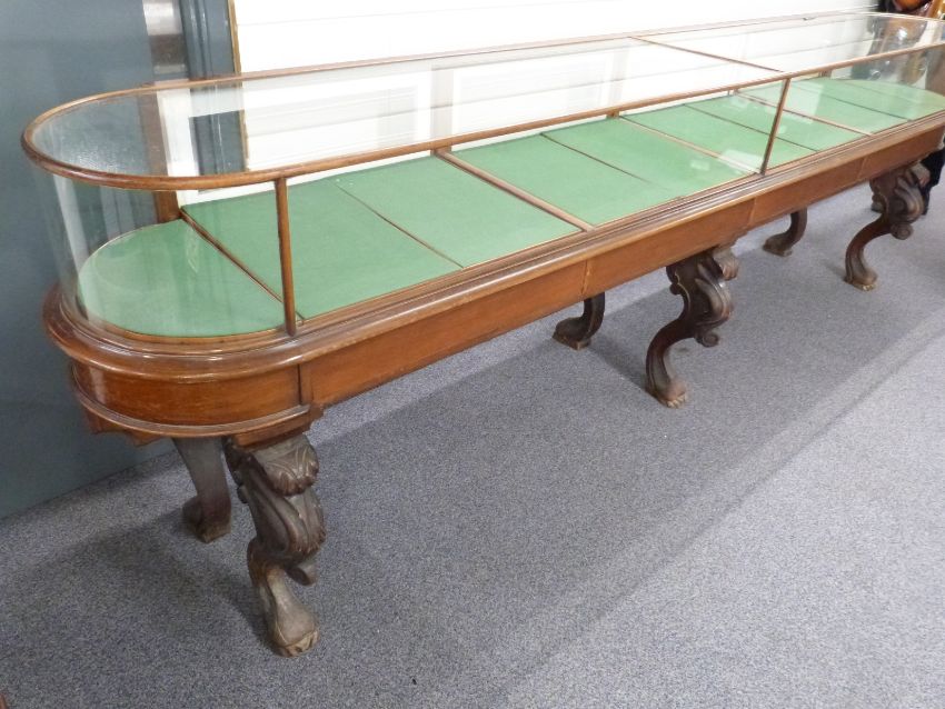 Victorian oval glazed museum / shopfitting cabinet, the four fall flap doors with looped brass drop handles, the interior fitted with ten original baize lined trays, the whole raised on six carved cabriole legs with lion pad feet, W340 x D60 x H102cm