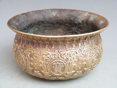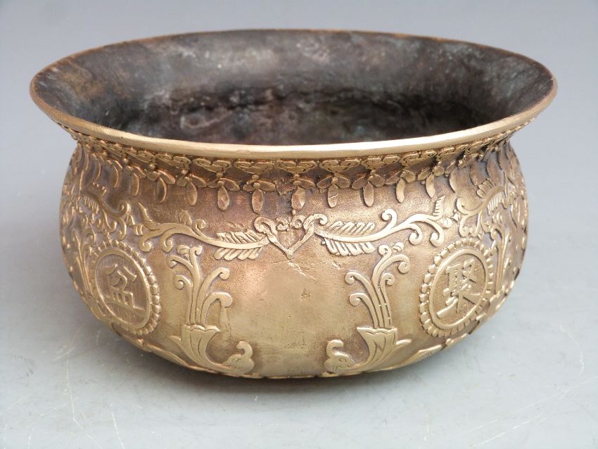 Chinese bronze bowl with character and fish decoration and Qianlong mark to base, 8.5 tall, 17cm diameter