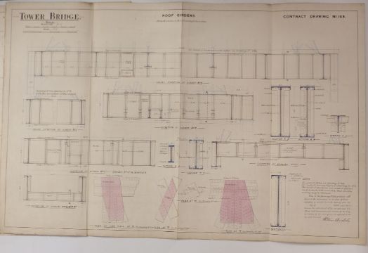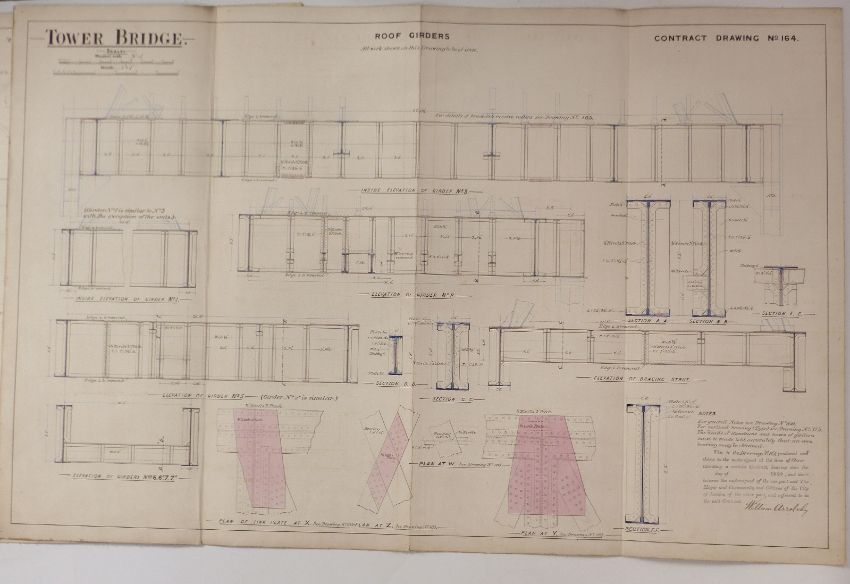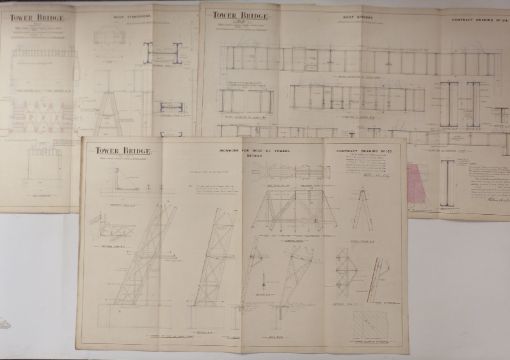 Tower Bridge, London, three Victorian architect's or civil engineering drawings depicting the roof structure, all dated 1889, each 64 x 98cm