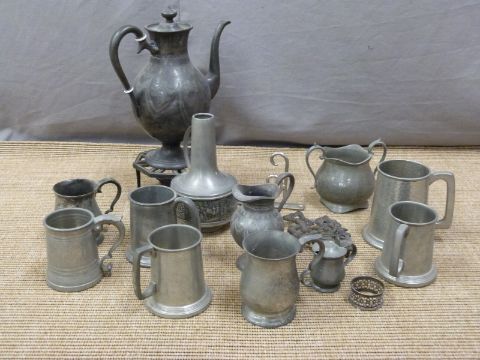 Quantity of 19th century and later pewter and other metalware including teapot