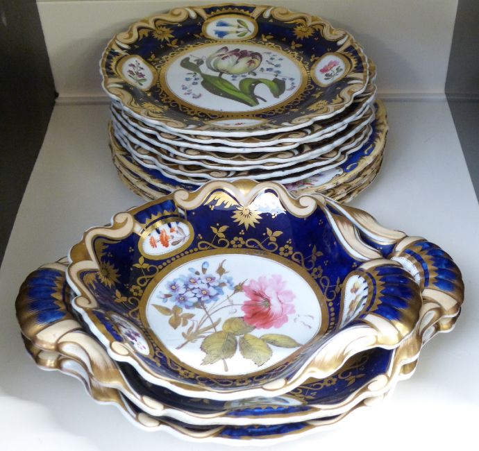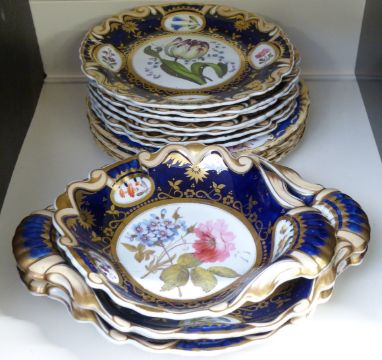 19thC porcelain dessert service, hand-decorated with botanical subjects