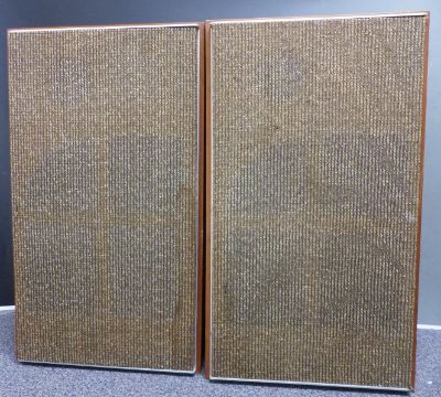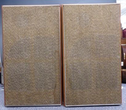 Pair of teak piston action sandwich speakers, each 65cm tall