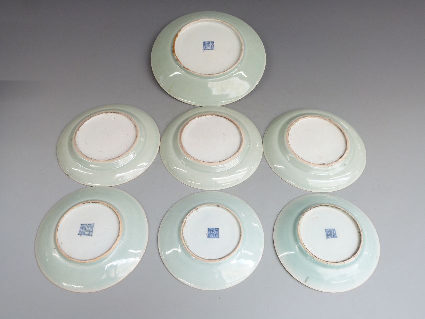 Seven Chinese Canton famille rose plates each decorated with birds, butterflies and flowers, largest 26cm in diameter.