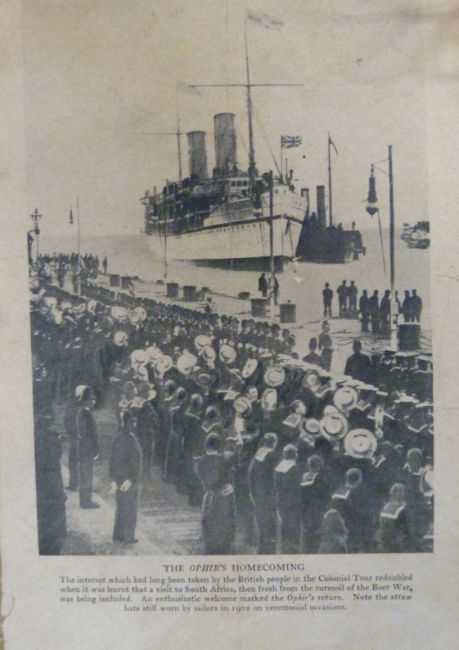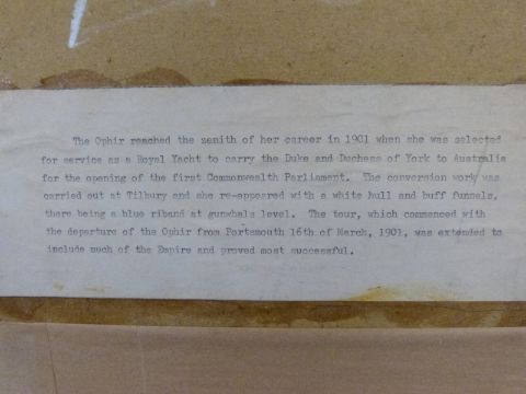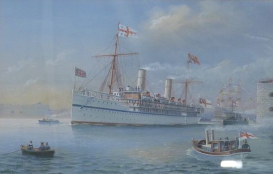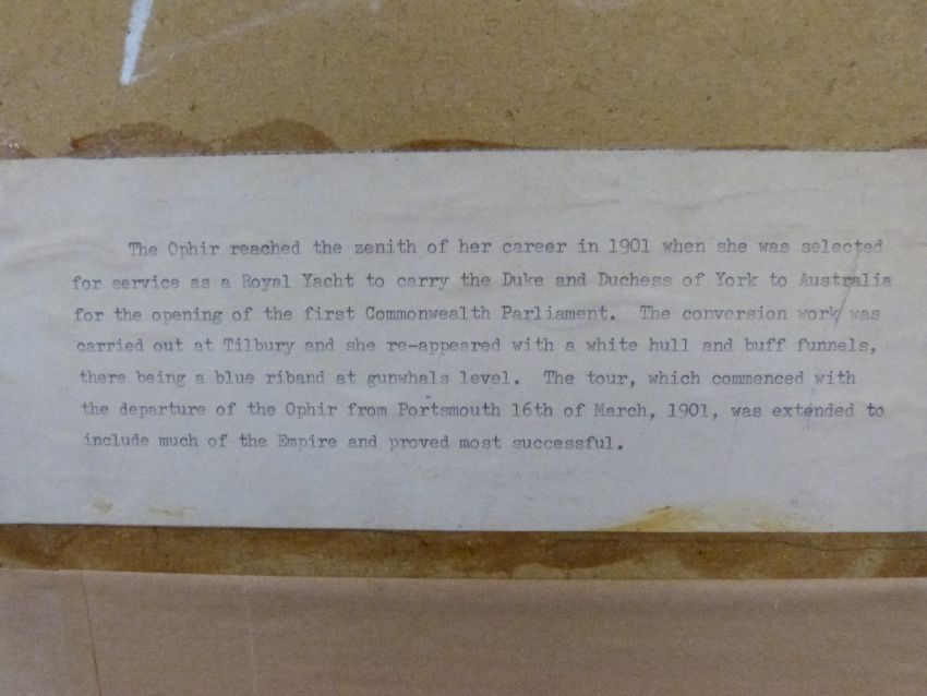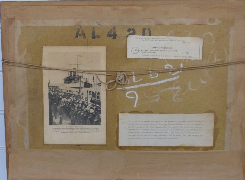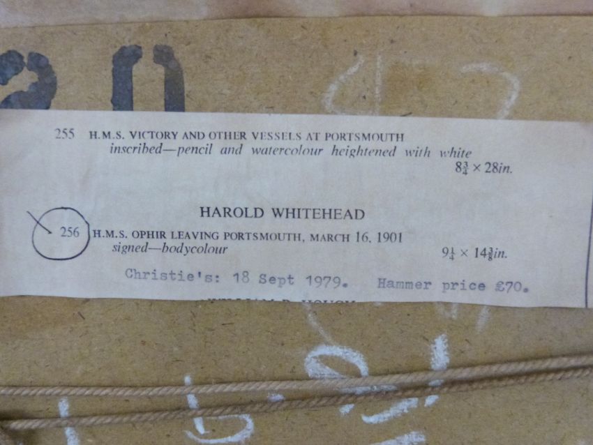 Harold Whitehead watercolour HMS Ophir leaving Portsmouth March 16th 1901, the date the liner set off with the Duke and Duchess of York to Australia whilst taking the role of the Royal Yacht, signed lower left, 23 x 36cm, with details of the voyage and Christie's auction details verso
