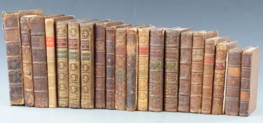 [Antiquarian Bindings] A collection of largely odd volumes including The Beauties of Shakespeare by William Dodd 1780, The Works of Virgil by Dryden 1763 with engraved plates, Gay’s Fables illustrated with engravings, Works of Dr. Jonathan Swift 1765 illustrated, The Inspector volume the second 1753, Works of Mr. Abraham Cowley 1711, Poems by John Hughes 1735, Jacobi Vanierii, Des Postes du Royaume De France 1818 with map and others all in leather (20)
