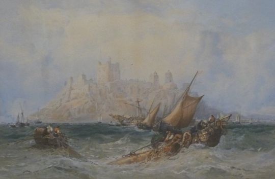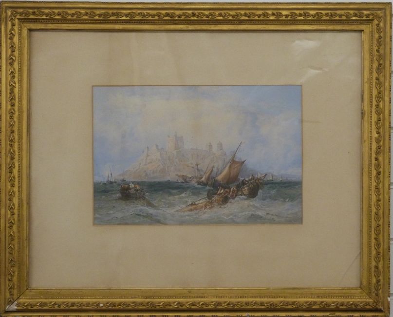 James Webb (1825 - 1895) watercolour maritime scene, hauling nets / wreckage with citadel in the background, 24 x 37cm