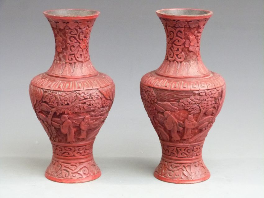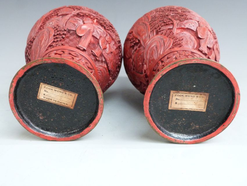 A pair of Chinese cinnabar pedestal vases, label to base Fook Weng and Co, H22cm