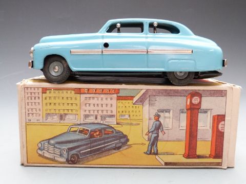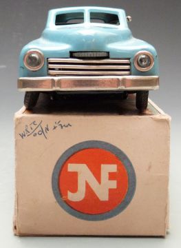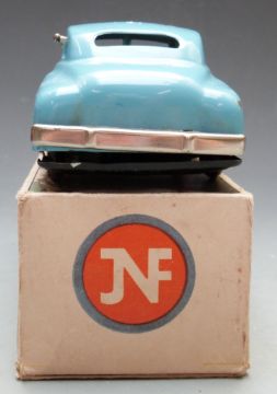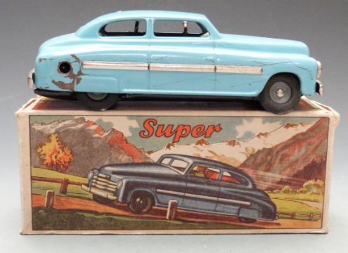 JNF German clockwork tinpate Super car with pale blue body, detailed interior and original key, in original box with instructions.