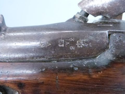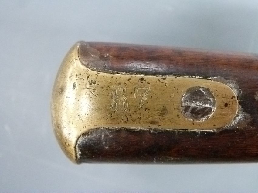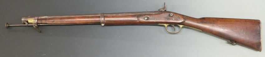 Indian Army 20 bore percussion hammer action two band cavalry carbine smooth bored rifle with lock stamped 1856 Tower, brass trigger guard and mounts, sling suspension mounts, captive ram-rod, stock stamped 57 and 21 inch barrel, overall length 93.5cm.