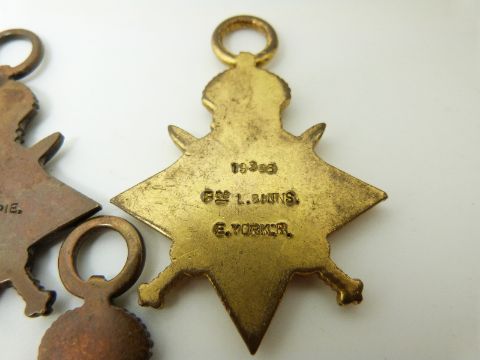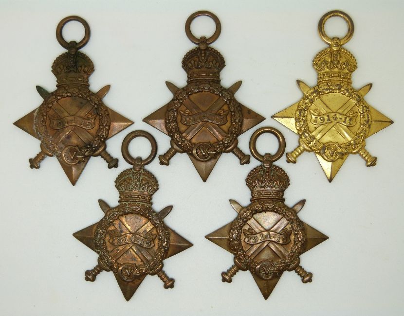 British Army WWI medals comprising five 1914/1915 Stars, named to 18012 Pte Lewis Royal Welsh Fusiliers, 19496 Pte W Gillispie Liverpool Regiment, 2185 Pte J Read East Lancashire Regiment, 19366 Pte L Binns East Yorkshire Regiment and 10085 Pte J Scotney Suffolk Regiment