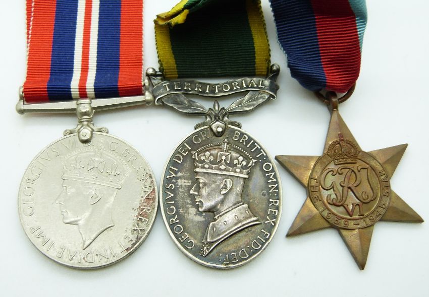 British Army WWII medals comprising 1939/1945 Star, War Medal and Territorial Efficiency Medal named to 4193486 Gunner J Johnson, Royal Artillery, POW