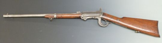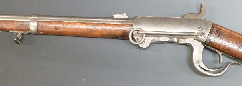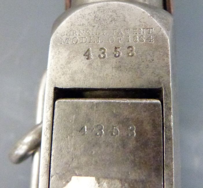 Burnside model 1864 breech loading underlever percussion hammer action carbine rifle with pop-up sights, belt loop, top flat stamped 'Burnside Patent Model of 1864' and 21 inch barrel, overall length 99cm, serial number 4353.