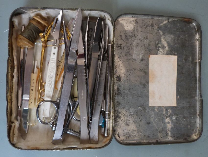 A collection of medical / surgical instruments comprising largely ENT / dental examples to include cased dental syringe, tooth extractor, forceps 73L by Ash of England, speculum, curettes, dial sphygmomanometer, safety corn and callosity knife, cased Auriscope etc