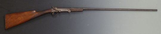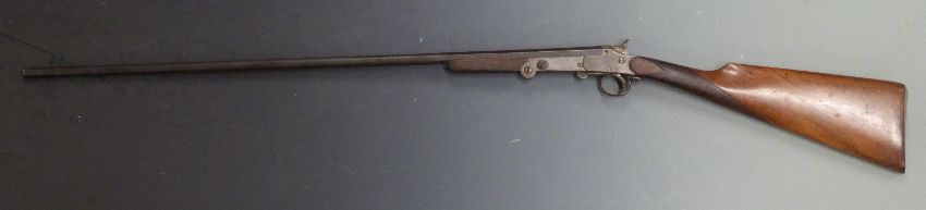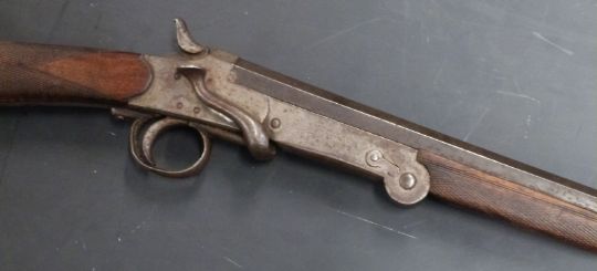 Belgian 9mm folding hammer action garden gun with chequered grip and forend and 29.5 inch part octagonal barrel, overall length 115cm, serial number 6. PLEASE NOTE THAT A VALID RELEVANT FIREARMS/SHOTGUN CERTIFICATE IS REQUIRED TO HANDLE/PURCHASE THIS ITEM.
