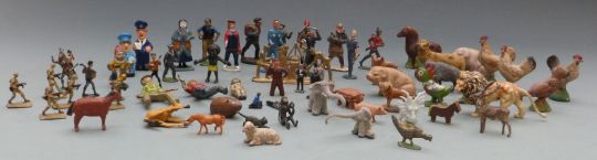 Approximately 50 Britains and similar lead, wood and other model figures and animals.