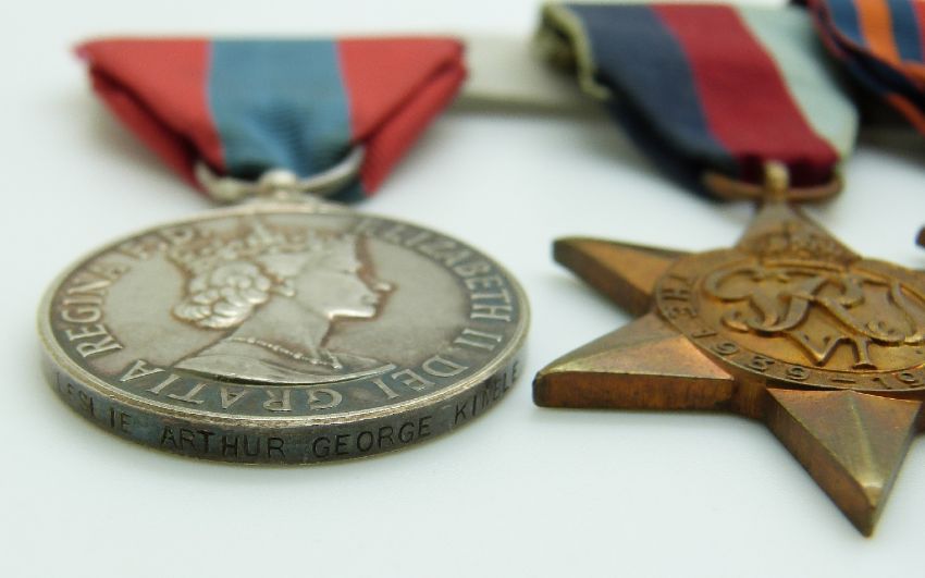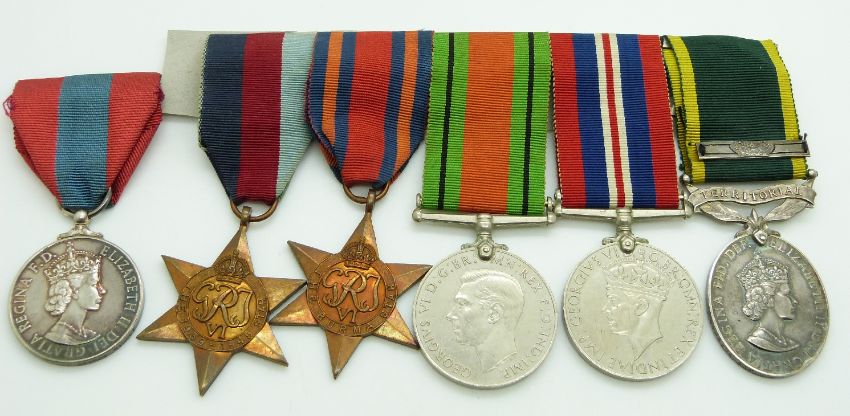 British Army WWII medals comprising 1939/1945 Star, Burma Star, Defence Medal, War Medal and Territorial Efficiency Medal with bar named to 5566374 Sgt L A G Kimble, Royal Signals together with his Imperial Service Medal named to Lesley Arthur George Kimble