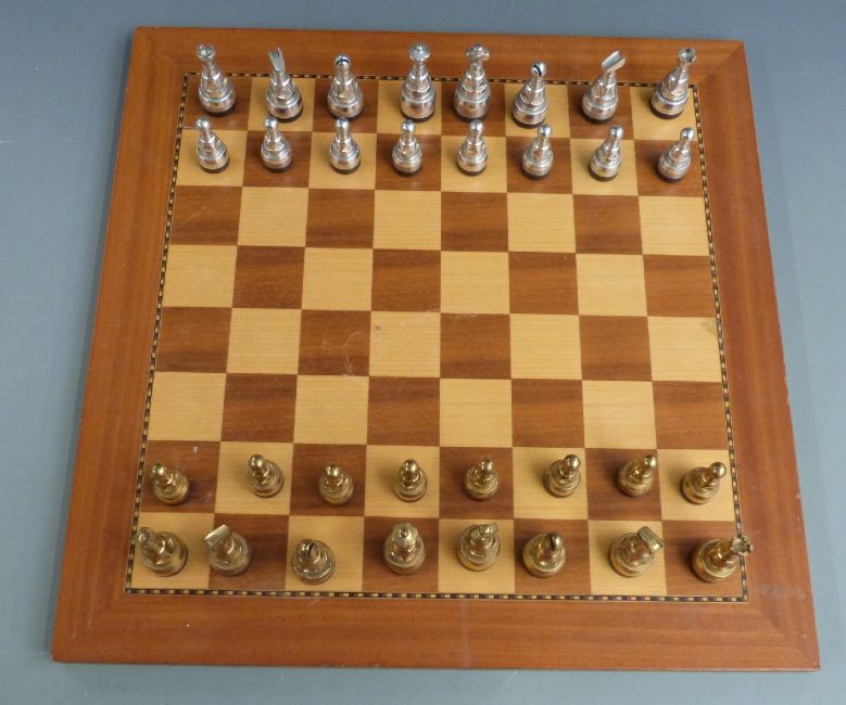 T I Machine Tools novelty metal chess set with pieces in the form of Jaguar car tools/ parts, height of king 7cm, on inlaid wooden board.