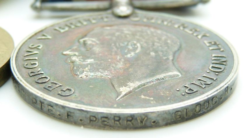 British Army WWI medals comprising War Medal and Victory Medal named to 24840 Pte F Perry, Gloucestershire Regiment