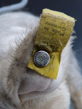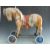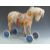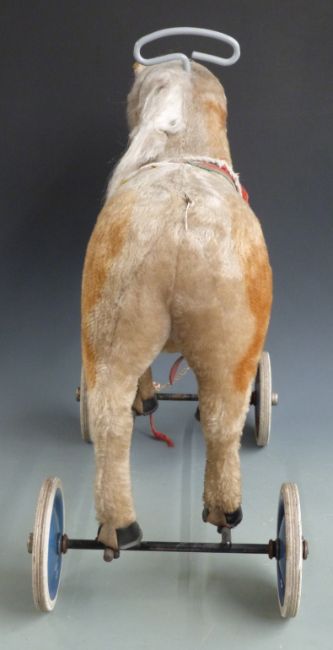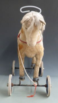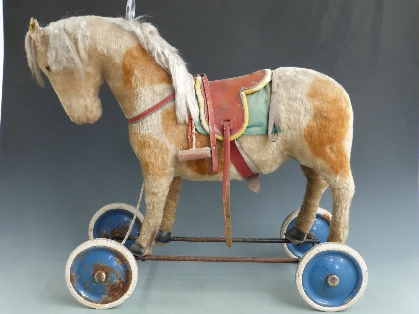 Steiff ride on horse on wheels with shaved spotted mohair, leather saddle, blue metal wheels and original button and label to the ear, 69cm long.