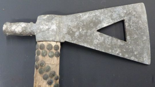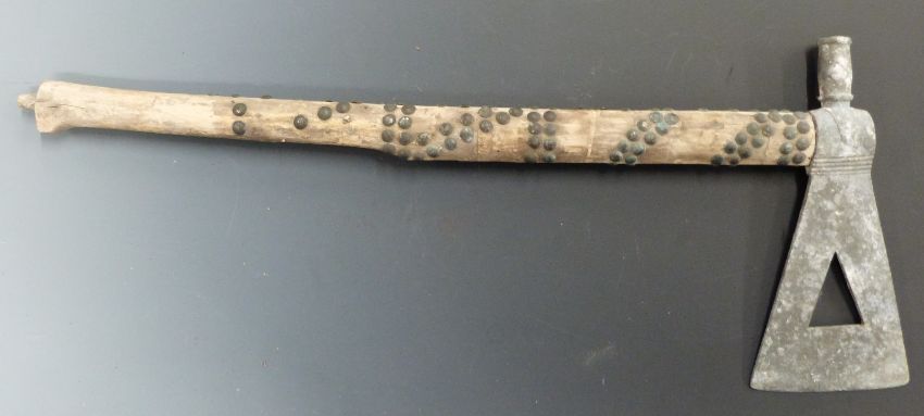 North American Indian 19thC Tomahawk peace pipe axe with stud work decoration purchased by the vendor's family from Portage La Prairie Manidoba and brought back to England in 1895 along with a Winchester gun sold by this auction house in February 2019. Length of staff 61cm, tomahawk head 26cm
