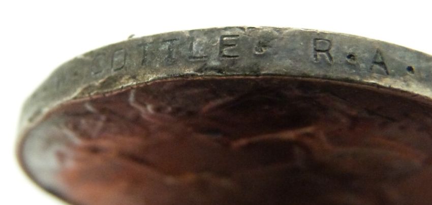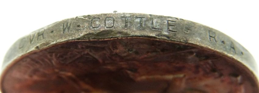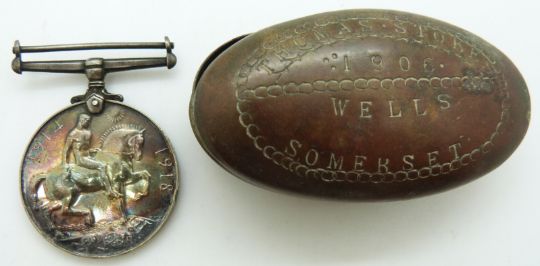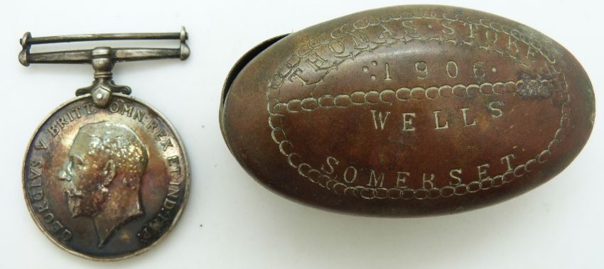 British Army WWI medal named to 269530 Dvr W Cottle, RA and a brass trench art snuff box Thomas Stokes, Wells, Somerset