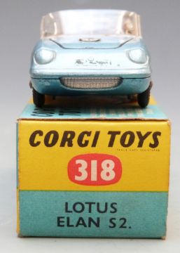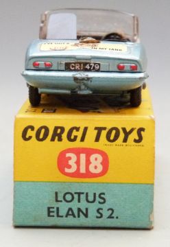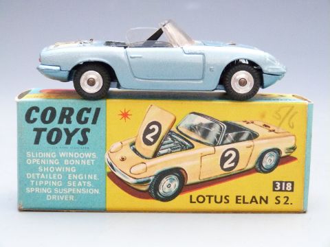 Corgi Toys diecast model Lotus Elan S2 with pale blue body, black interior and racing decals, 318, in original box.