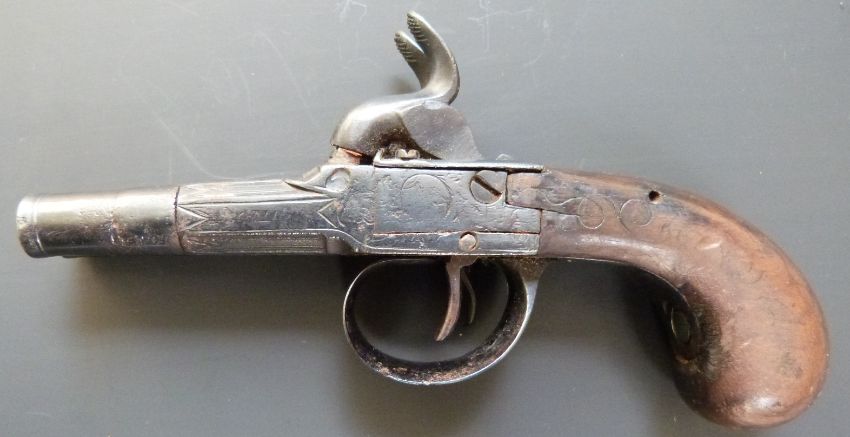 English side by side percussion hammer action pistol with engraved lock and trigger guard, wire inlaid stock and indistinctly named barrels, overall length 16cm.
