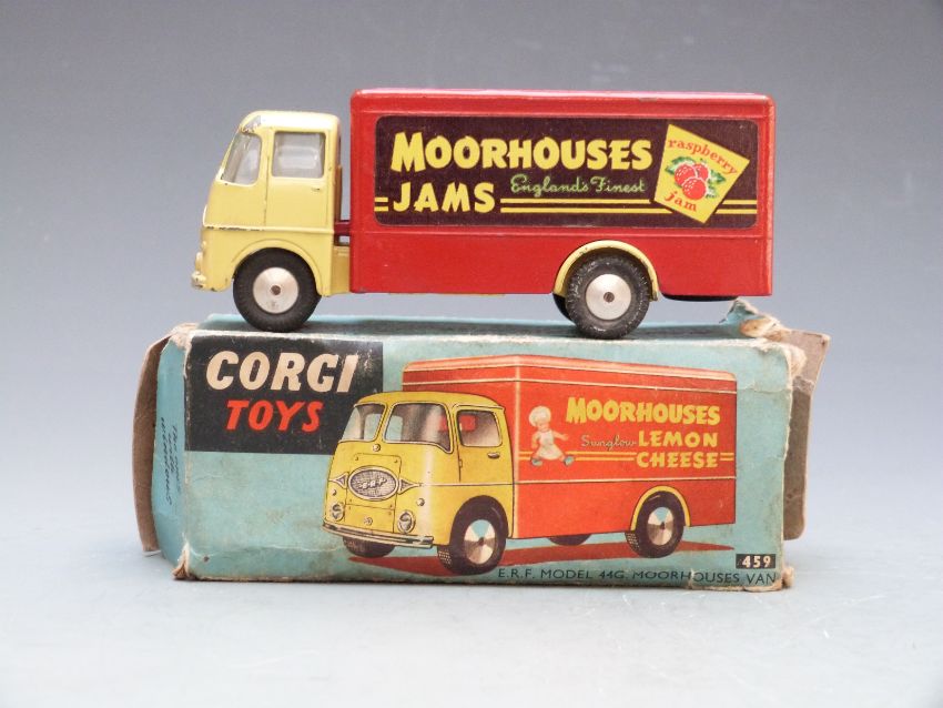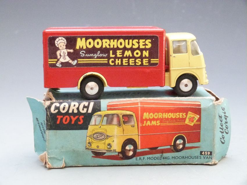 Corgi Toys diecast model ERF Model 44G Moorhouses Van with pale yellow cab, red body and 'Moorhouses Sunglow Lemon Cheese' decals, 459, in original box.