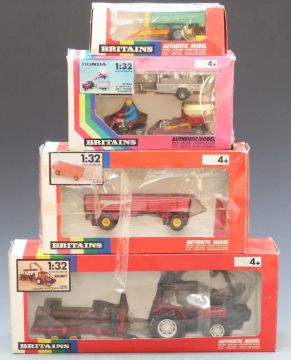 Four Britains model tractors and farm vehicle sets comprising Valmet Logging Tractor and Trailer 9627, TRX300 4x4 All Terrain Vehicle Logic CT700 Trailer Veri Spreader 9431, 4-Wheeled Trailer 9567 and Tipping Trailer 9565, all in original boxes.