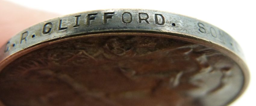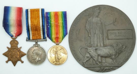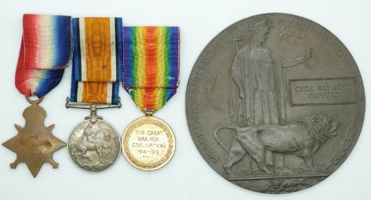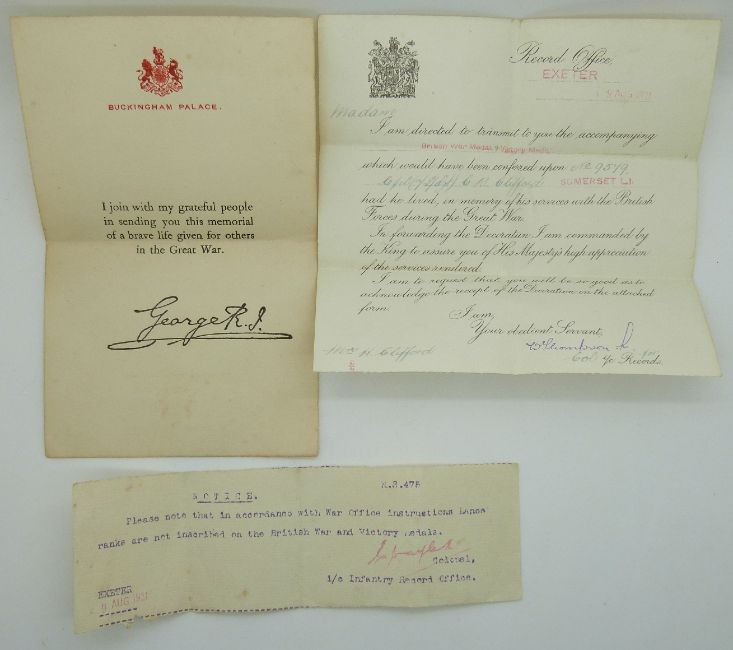 British Army WWI medals comprising 1914 'Mons' Star, War Medal and Victory Medal named to 9579 Lcpl/Cpl C R Clifford, 1st Battalion Somerset Light Infantry, together with his Memorial Plaque (Cecil Raymond Clifford) and letters