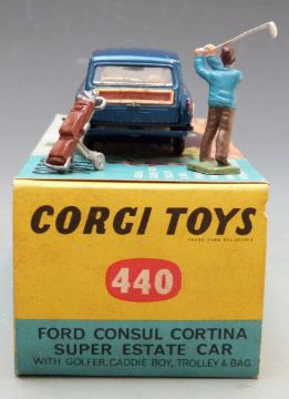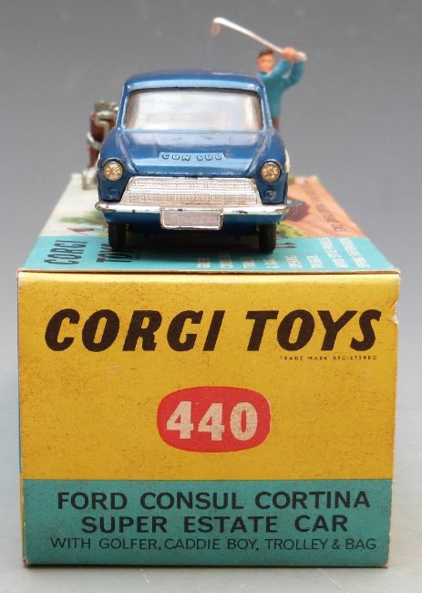 Corgi Toys diecast model Ford Consul Cortina Super Estate with metallic blue body and white and faux wood panels, 440, in original box.
