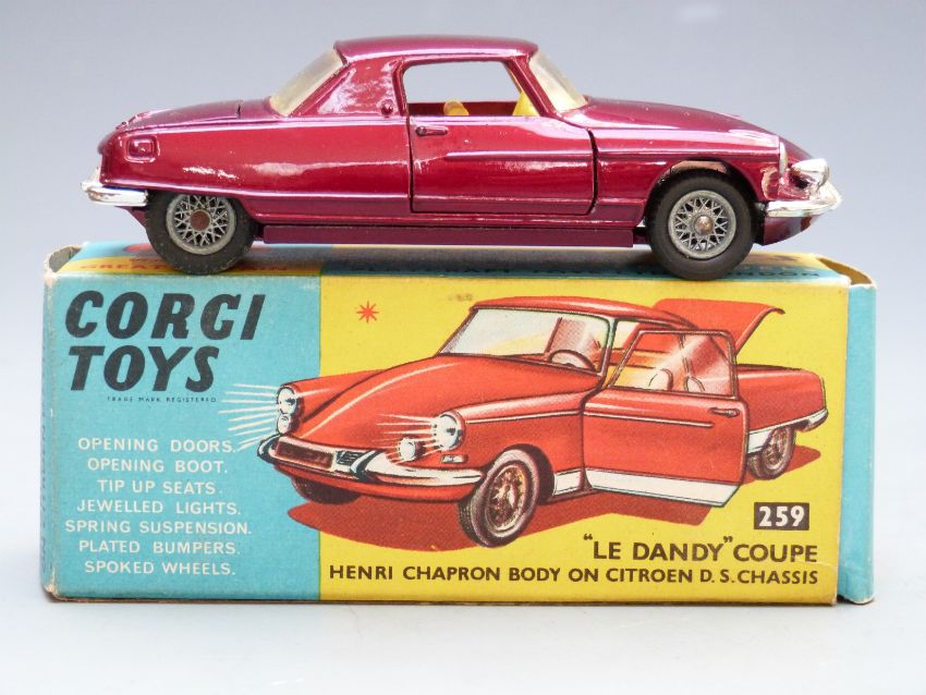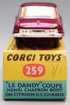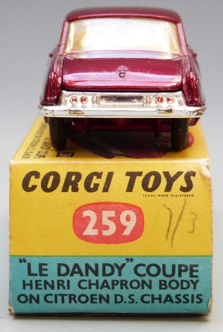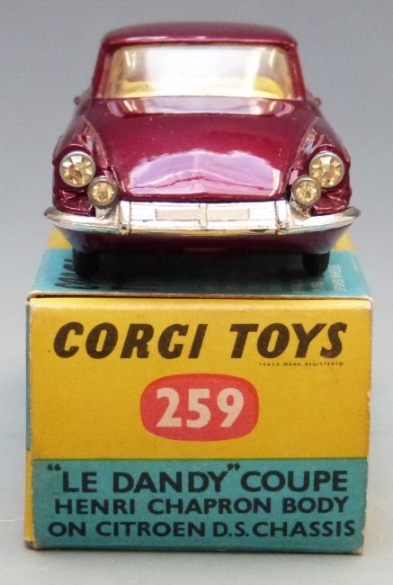 Corgi Toys diecast model 'Le Dandy' Coupe Henri Chapron Body on Citroen D.5. Chassis with maroon body and lemon interior, 259, in original box.