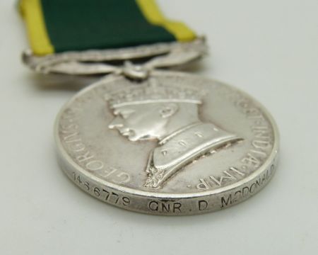 British Army Territorial Efficiency Medal (George VI) named to 1466779 Gunner D McDonald, Royal Artillery