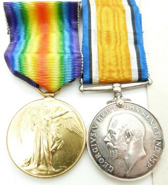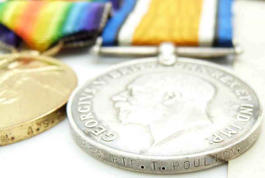 British Army WWI medals comprising War Medal and Victory Medal named to 095363 Pte T Poulton, Army Service Corps, together with photographs