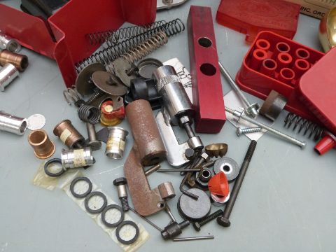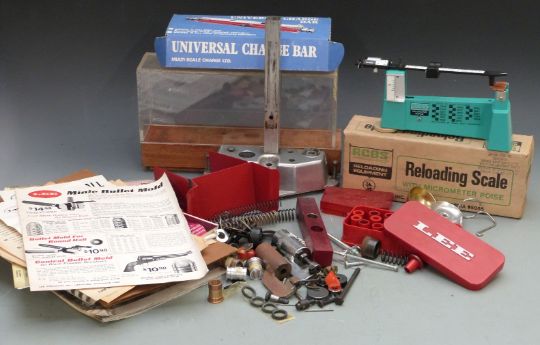 A collection of shotgun cartridge loading accessories including Lee reloading scale in original box