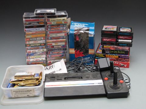 Atari 2600 video games console together with 47 various Atari and Commodore games and cartridges, Super-Deluxe Competition Joystick etc, most in original boxes together with a small collection of Pokemon cards.