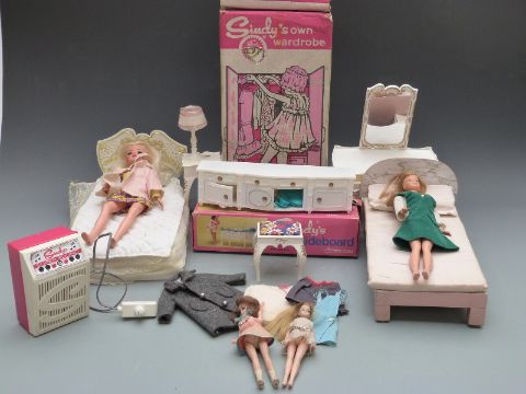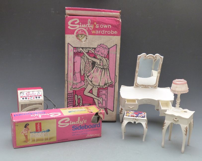 A collection of Sindy dolls, outfits and accessories including Wardrobe, Sideboard, Super Sound etc, some in original boxes.