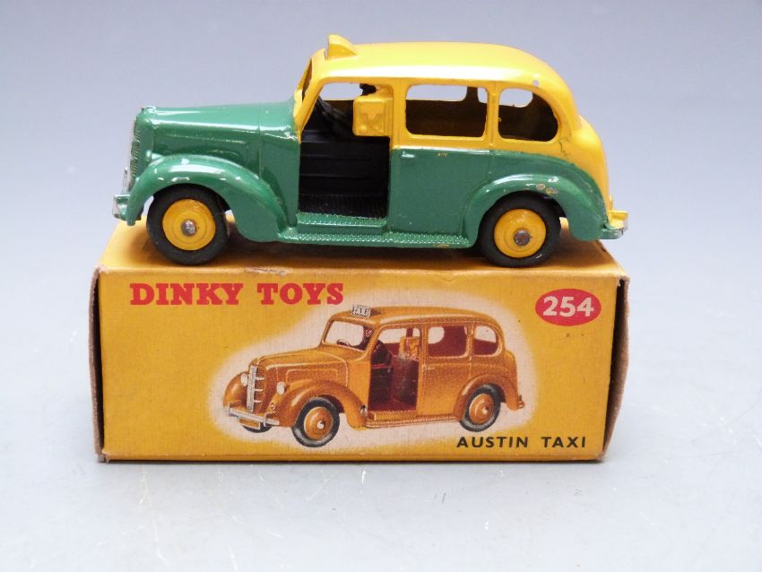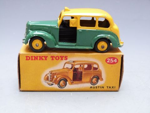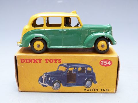 Dinky Toys diecast model Austin Taxi with green and yellow body and yellow hubs, 254, in original box.