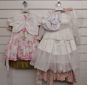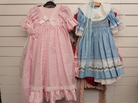 Twelve various girls' or dolls' dresses, many with floral and animal patterns and lace decoration.