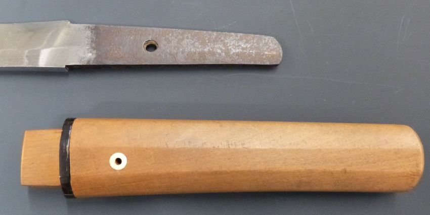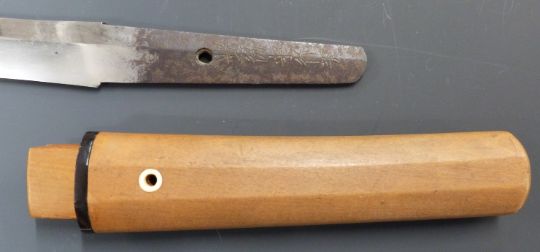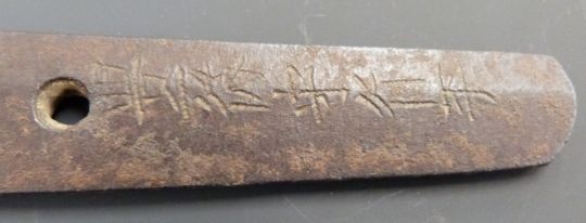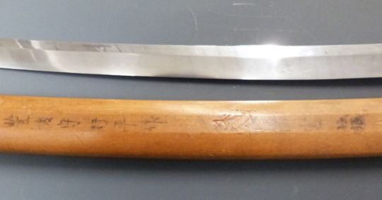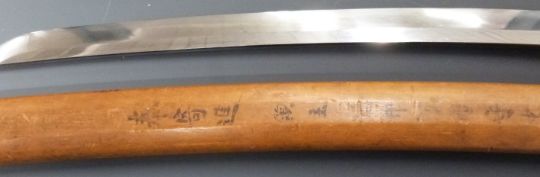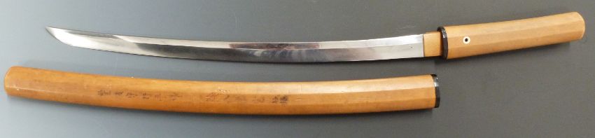 Late 16thC Japanese Wakizashi sword with 46cm blade and signed to tang Yukihira, in scripted wooden shirisaya, overall length 69cm.