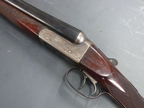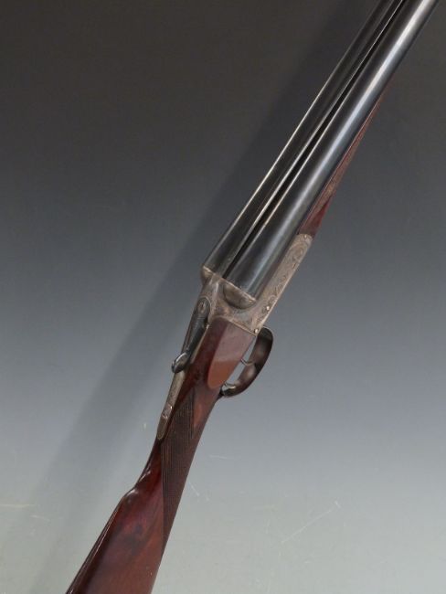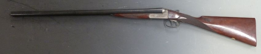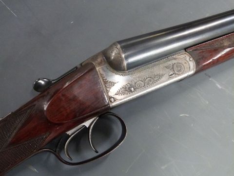 Army & Navy CSL 12 bore side by side ejector shotgun with named and engraved lock, engraved trigger guard, underside and top plate, chequered grip and forend, vacant cartouche to the underside of the stock, double trigger and 28 inch barrels, overall length 114cm, serial number 68236.  PLEASE NOTE THAT A VALID RELEVANT FIREARMS/SHOTGUN CERTIFICATE IS REQUIRED TO HANDLE/PURCHASE THIS ITEM.