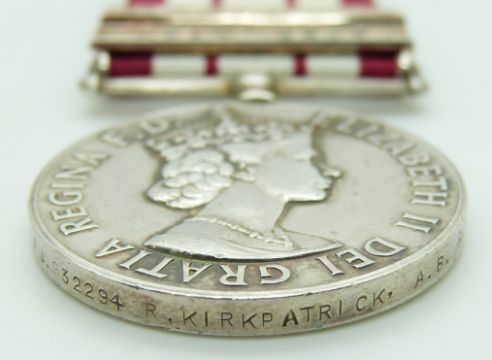 Royal Navy Naval General Service Medal with clasp for Cyprus and Near East (copies) named to 932294 R Kirkpatrick AB, RN